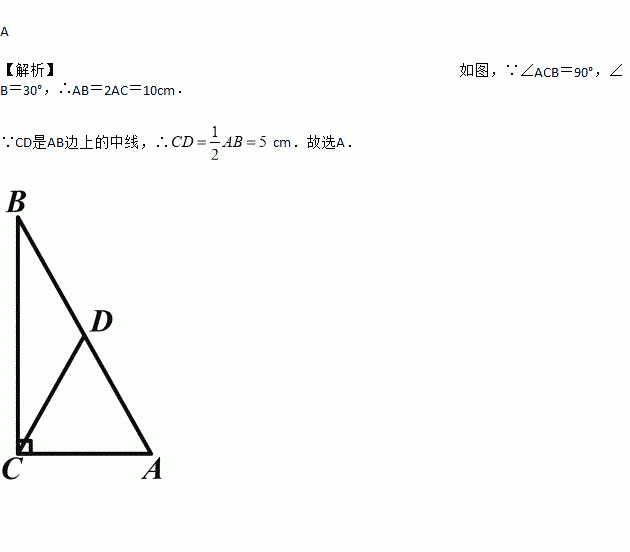 在Rt△ABC中,∠C=90°,∠B=30°,最短边长为5cm,则最长边上的中线长是( )