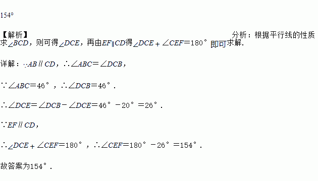 如图,AB∥EF∥CD,∠ABC=46°,∠BCE=20°,则∠CEF=____________