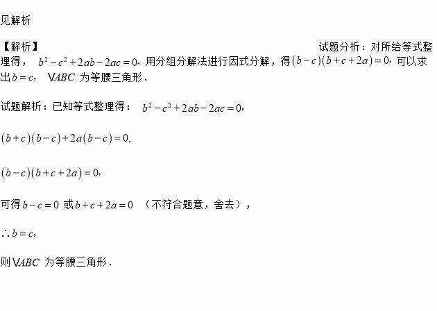 已知a,b,c是△ABC的三条边长,当 b2+2ab=c2+2ac时,探索△ABC的形状,并说明理由.
