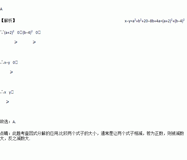A 【解析】x?y=a2+b2+20?8b+4a=(a+2)2+(b?4)2 ∵(a+2)2?0,(b?4)2?0, ∴x?y?0, ∴x?y, 故选:A. 点睛:此题考查因式分解的应用.比较两个式子的大小,通常是让两个式子相减,若为正数,则被减数大,反之减数大.如图,已知钝角△ABC,依下列步骤尺规作图,并保留作图痕迹.