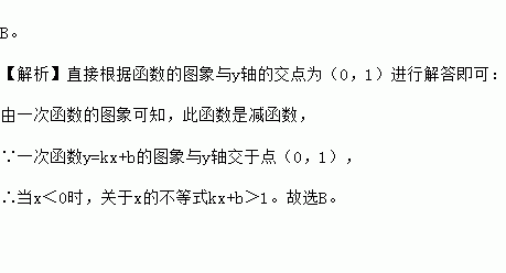 如图,一次函数y=kx+b的图象与y轴交于点(0,1),则关于x的不等式kx+b>1的解集是【 】