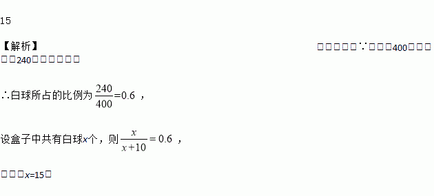 一个不透明的盒子中装有10个黑球和若干个白球,它们除颜色不同外,其余均相同,从盒子中随机摸出一球记下其颜色,再把它放回盒子中摇匀,重复上述过程,共试验400次,其中有240次摸到白球,由此估计盒子中的白球大约有________个.