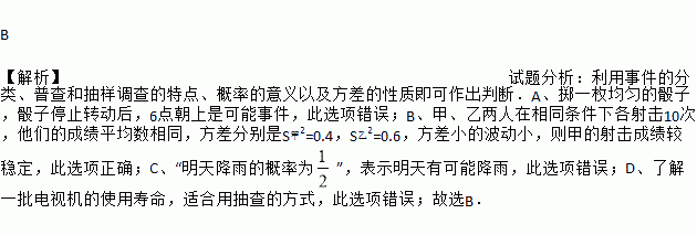 B. 甲、乙两人在相同条件下各射击10次,他们的成绩平均数相同,方差分别是S甲2=0.4,S乙2=0.6,则甲的射击成绩较稳定