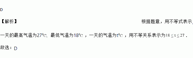贵阳市今年月份的最高气温为,27最低气温为18,已知某一天的气温为t,则下面表示气温之间的不等关系正确的是( )