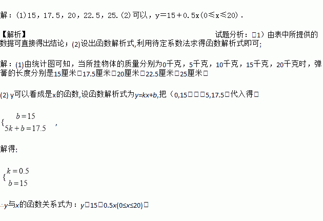 (1)当所挂物体的质量分别为0千克,5千克,10千克,15千克,20千克时,弹簧的长度分别是多少厘米?
