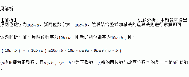 设一个两位数的个位数字为a,十位数字为b (均为正整数,且),若把这个两位数的个位数字和十位数字交换位置得到一个新的两位数,则新的两位数与原两位数的差