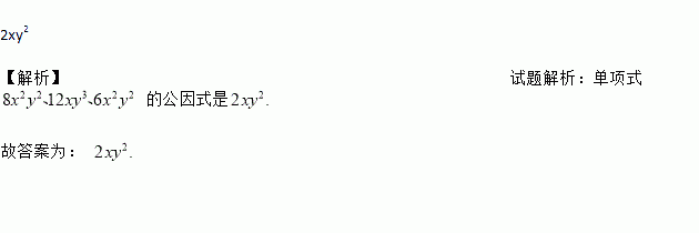 单项式8x2y2、12xy3、6x2y2的公因式是________.