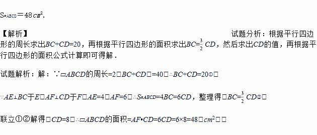 如图,在?ABCD中,AE⊥BC于点E,AF⊥CD于点F,AE=4 cm,AF=6 cm,?ABCD的周长为40 cm,求?ABCD的面积.