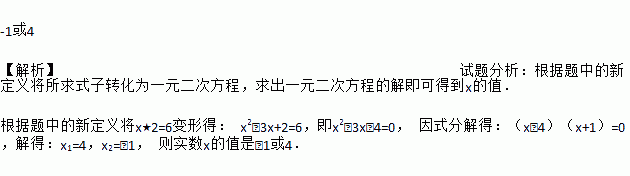 -1或4 【解析】试题分析:根据题中的新定义将所求式子转化为一元二次方程,求出一元二次方程的解即可得到x的值. 根据题中的新定义将x★2=6变形得: x2﹣3x+2=6,即x2﹣3x﹣4=0, 因式分解得:(x﹣4)(x+1)=0,解得:x1=4,x2=﹣1, 则实数x的值是﹣1或4.