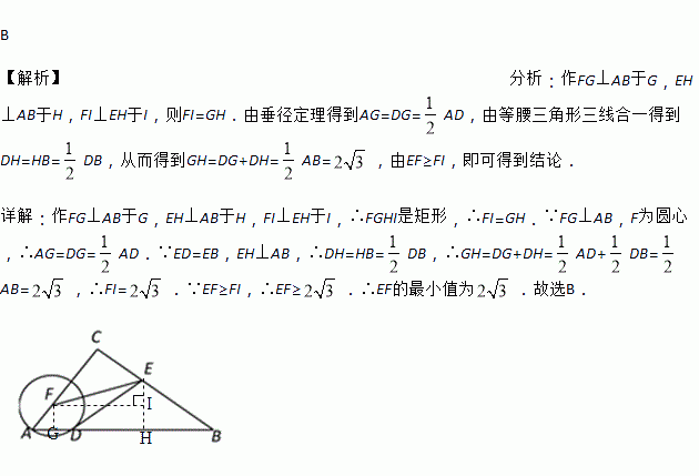 如图,Rt△ABC中,∠C=90°,AB=4,F是线段AC上一点,过点A的⊙F交AB于点D,E是线段BC上一点,且ED=EB,则EF的最小值为 ( )