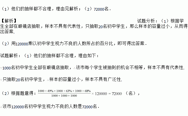 (1)小明在眼镜店调查了1000名初中学生的视力,小刚在邻居中调查了20名初中学生的视力,他们的抽样是否合理?并说明理由.