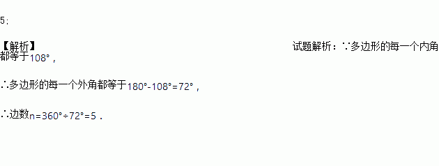 若多边形的每一个内角均为108°,则这个多边形的边数为___________