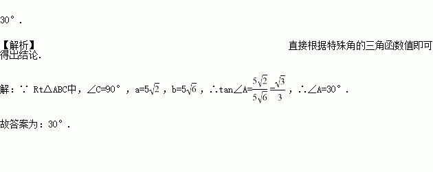 在Rt△ABC中,∠C=90°,a=5,b=5,则∠A=___________.