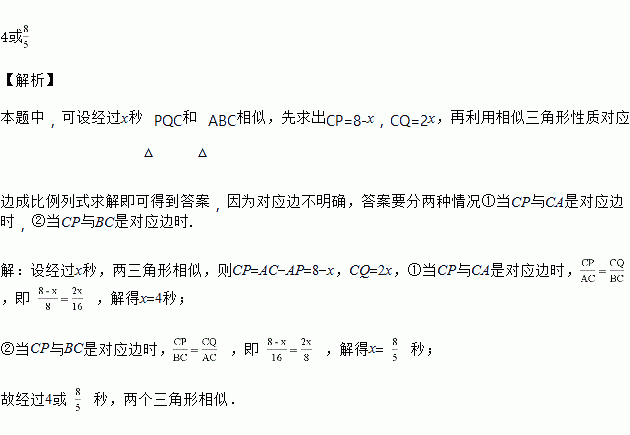 如图,在△ABC中,AC=8cm,BC=16cm,点P从点A出发,沿着AC边向点C以1cm/s的速度运动,点Q从点C出发,沿着CB边向点B以2cm/s的速度运动,如果P与Q同时出发,经过几秒△PQC和△ABC相似?