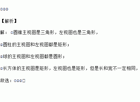 在常见的几何体圆锥、圆柱、球、长方体中,主视图与它的左视图一定完全相同的几何体有__________(填编号)