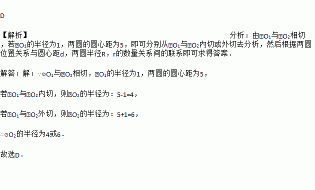 D 【解析】分析:由⊙O1与⊙O2相切,若⊙O1的半径为1,两圆的圆心距为5,即可分别从⊙O1与⊙O2内切或外切去分析,然后根据两圆位置关系与圆心距d,两圆半径R,r的数量关系间的联系即可求得答案. 解答:【解析】 ∵⊙O1与⊙O2相切,⊙O1的半径为1,两圆的圆心距为5, 若⊙O1与⊙O2内切,则⊙O2的半径为:5-1=4, 若⊙O1与⊙O2外切,则⊙O2的半径为:5+...