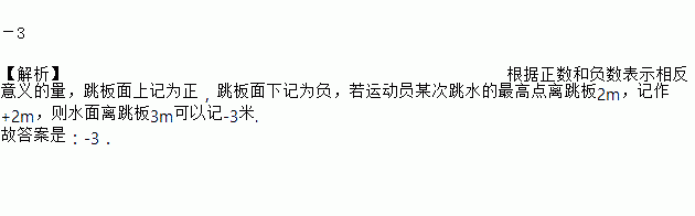 -3 【解析】根据正数和负数表示相反意义的量,跳板面上记为正,跳板面下记为负,若运动员某次跳水的最高点离跳板2m,记作+2m,则水面离跳板3m可以记-3米. 故答案是:-3.