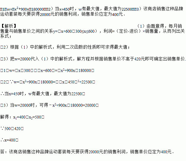 (3)如果物价部门规定这种品牌运动套装的销售单价不高于420元,该商店销售这种品牌运动套装每天要获得20000元的销售利润,销售单价应定为多少元?