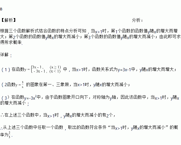 给出下列函数:①; ②; ③.从中任取一个函数,取出的函数符合条件“当时,函数值随增大而减小”的概率是( ).
