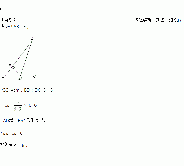6 【解析】试题解析:如图,过点D作DE⊥AB于E, ∵BC=4cm,BD:DC=5:3, ∴CD=×16=6, ∵AD是∠BAC的平分线, ∴DE=CD=6. 故答案为:6.
