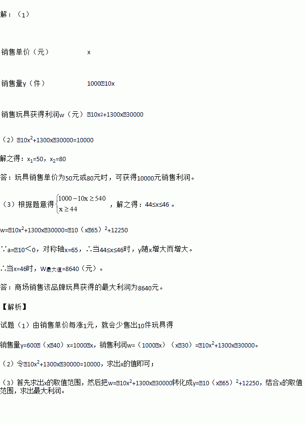 某商场经营某种品牌的玩具,购进时的单价是30元,根据市场调查:在一段时间内,销售单价是40元时,销售量是600件,而销售单价每涨1元,就会少售出10件玩具.