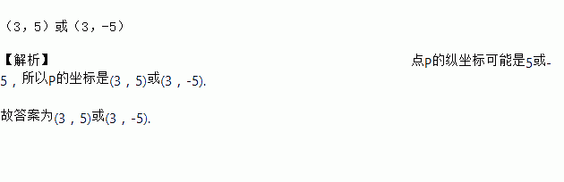 (3,5)或(3,-5) 【解析】点P的纵坐标可能是5或-5,所以P的坐标是(3,5)或(3,-5). 故答案为(3,5)或(3,-5).