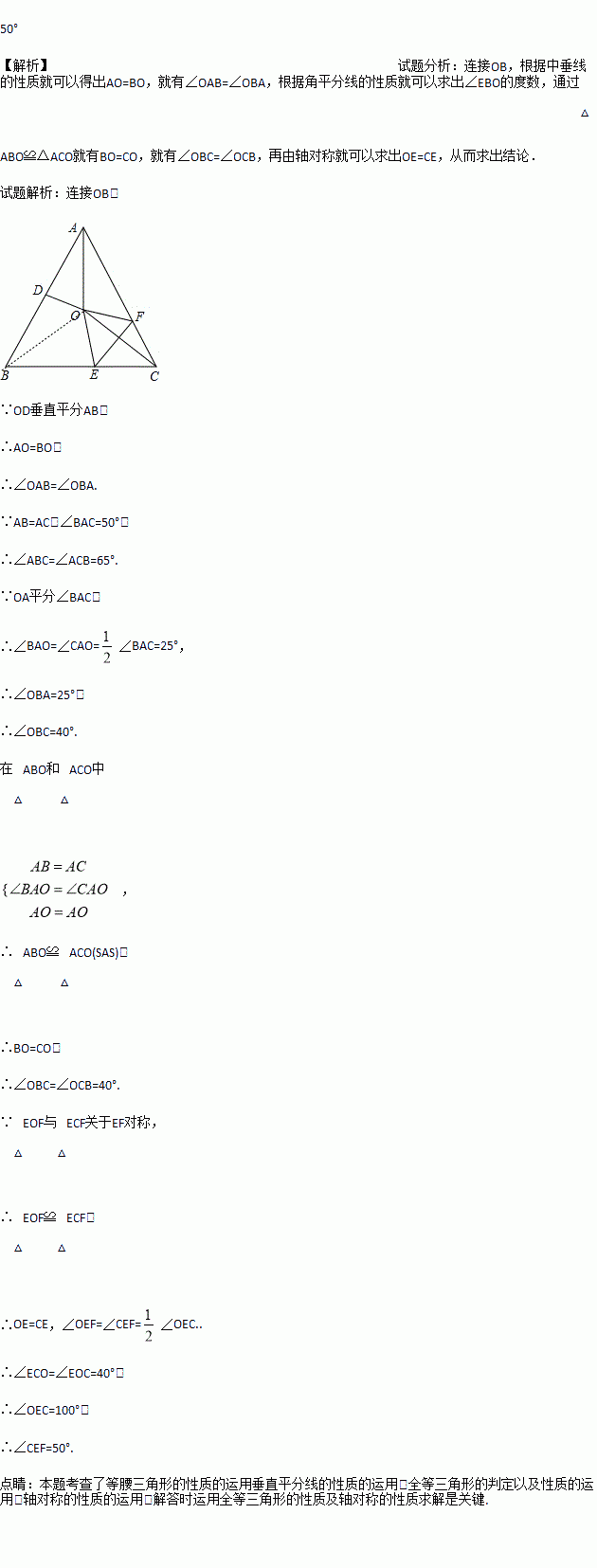 如图,在等腰三角形ABC中,AB=AC,∠BAC=50°.∠BAC的平分线与AB的中垂线相交于点O,点C沿EF折叠后与点O重合,求∠CEF的度数.