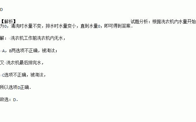 某洗衣机在洗涤衣服时经历了注水、清洗、排水三个连续过程(工作前洗衣机内无水),在这三个过程中洗衣机内水量y(升)与时间x(分)之间的函数关系对应的图象大致为( )