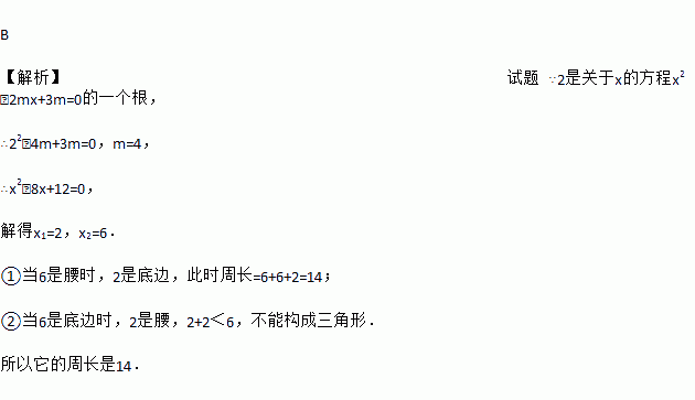 已知2是关于x的方程x2-2mx+3m=0的一个根,并且这个方程的两个根恰好是等腰三角形ABC的两条边长,则三角形ABC的周长为( )