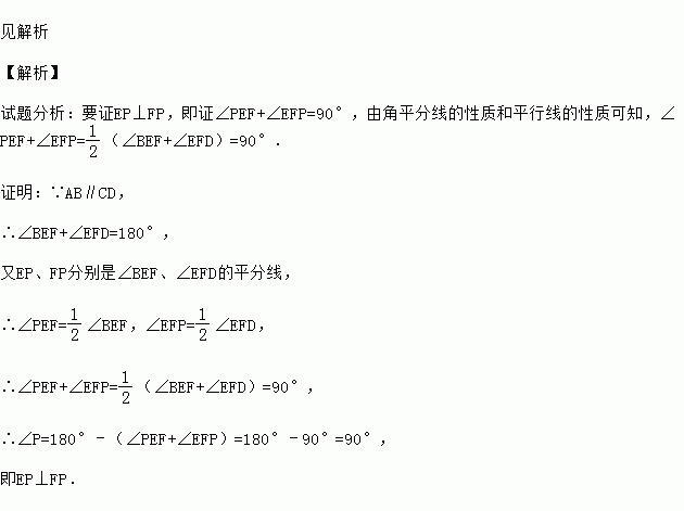 如图,已知AB∥CD,EF与AB、CD分别相交于点E、F,∠BEF与∠EFD的平分线相交于点P,求证:EP⊥FP.