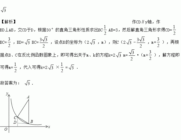 如图,在直角△ABC中,∠C=90°,∠A=30°,AB∥y轴,且AB=6,顶点B,C在反比例函数y=(x>0)的图象上,且点B的横坐标为2,则k=_____.