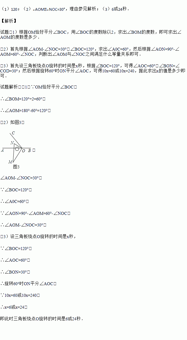 (1)如图2,将图1中的三角板绕点O逆时针旋转,使边OM在∠BOC的内部,且OM恰好平分∠BOC,此时∠AOM=_______度;∠BON= 度.