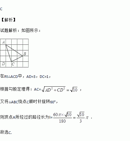 如图,在边长为1的正方形组成的网格中,△ABC的顶点都在格点上,将△ABC绕点C顺时针旋转60°,则顶点A所经过的路径长为( )