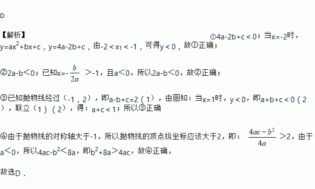 D 【解析】①4a-2b+c<0;当x=-2时,y=ax2+bx+c,y=4a-2b+c,由-2<x1<-1,可得y<0,故①正确; ②2a-b<0;已知x=- >-1,且a<0,所以2a-b<0,故②正确; ③已知抛物线经过(-1,2),即a-b+c=2(1),由图知:当x=1时,y<0,即a+b+c<0(2),联立(1)(2),得:a+c<1;所以③正确 ④由于抛物线的...