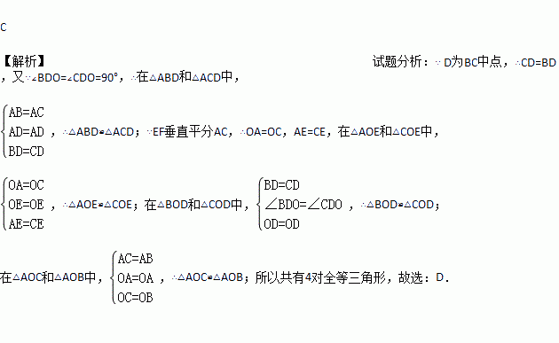 如图,△ABC中,AB=AC,D是BC的中点,AC的垂直平分线分别交AC、AD、AB于点E、O、F,则图中全等三角形的对数是