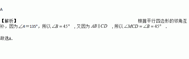 如图,在?ABCD中,M是BC延长线上的一点,若∠A=135°,则∠MCD的度数是( )