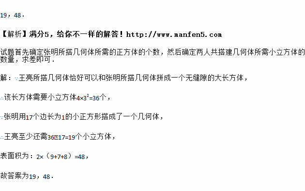 如图,在一次数学活动课上,张明用17个边长为1的小正方形搭成了一个几何体,然后他请王亮用其他同样的小正方体在旁边再搭一个几何体,使王亮所搭几何体恰好可以和张明所搭几何体拼成一个无缝隙的大长方体(不改变张明所搭几何体的形状),那么王亮至少还需要 个小立方体,王亮所搭几何体的表面积为 .