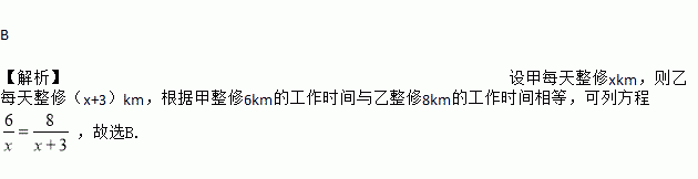 甲、乙两个工程队进行污水管道整修,已知乙比甲每天多修3km,甲整修6km的工作时间与乙整修8km的工作时间相等,求甲、乙两个工程队每天分别整修污水管道多少km?设甲每天整修xkm,则可列方程为( )