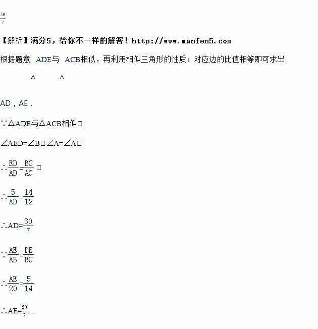 如图,已知△ABC中,AB=20,BC=14,AC=12,△ADE与△ACB相似,∠AED=∠B,DE=5.求AD,AE的长.