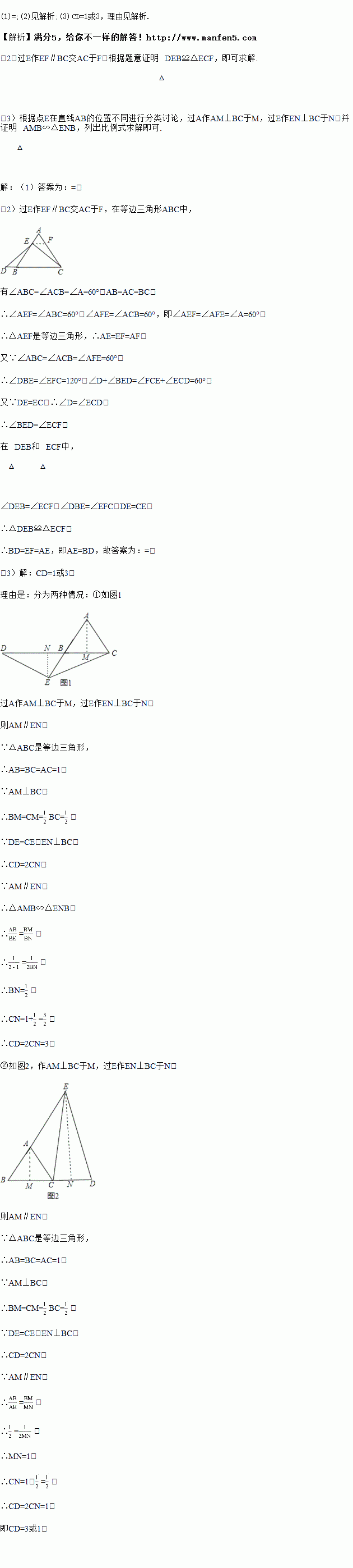 (3)在等边三角形ABC中,点E在直线AB上,点D在直线BC上,且ED = EC.若△ABC的边长为1,AE = 2,求CD的长.