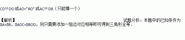 如图,已知线段AB、CD相交于点O,且∠A=∠B,只需补充一个条件_________,则有△AOC≌△BOD。