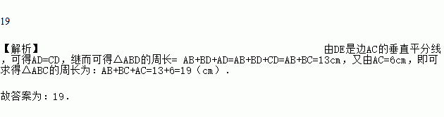 如图,在△ABC中,DE是AC的垂直平分线,AE=3cm,△ABD的周长为13cm,则△ABC的周长是_____cm.