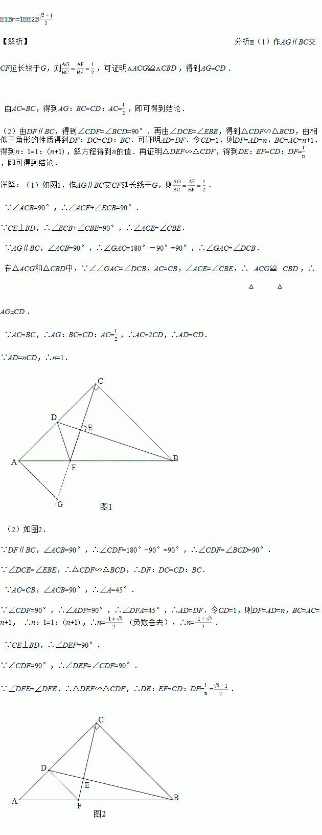 如图,△ABC中,∠ACB=90°,AC=BC,D是AC边上一点,AD=nCD,CE⊥BD于E交AB于F,连接DF.