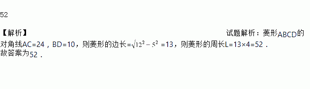 如图,菱形ABCD的对角线AC=24,BD=10,则菱形的周长=________.