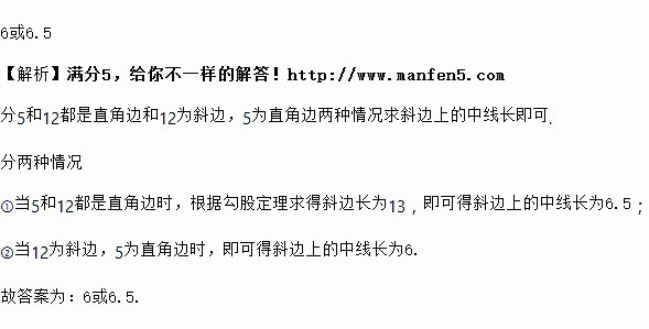 两边长分别为5,12的直角三角形,其斜边上的中线长为___________________.