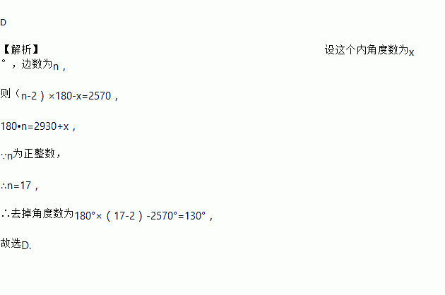若一个多边形除了一个内角外,其余各内角之和是2570°,则这个角是( )