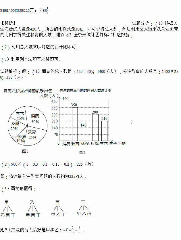 (3)在这次调查中,某单位共有甲、乙、丙、丁四人最关注教育问题,现准备从这四人中随机抽取两人进行座谈,求抽取的两人恰好是甲和乙的概率(列数状图或列表说明).