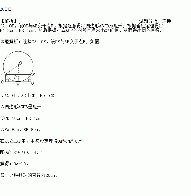 用工件槽(如图1)可以检测一种铁球的大小是否符合要求,已知工件槽的两个底角均为90°,尺寸如图(单位:cm).将形状规则的铁球放入槽内时,若同时具有图1所示的A、B、E三个接触点,该球的大小就符合要求.图2是过球心O及A、B、E三点的截面示意图,求这种铁球的直径.