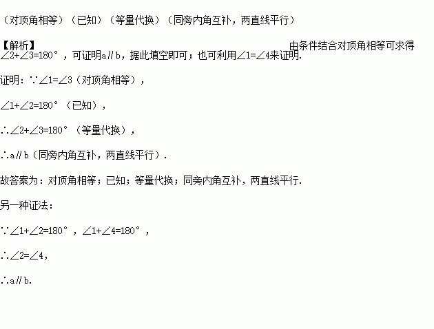 证明:∵ ∠1=∠3(_____),∠1+∠2=180°(_____),