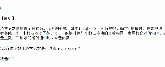 去年5月,在成都举行的世界机场城市大会上,成都新机场规划蓝图首次亮相,新机场建成后,成都将成为既北京、上海之后,国内第三个拥有至少两个机场的城市,按照远期规划,新机场将建的4个航站楼的总面积约为120万平方米,用科学记数法表示120万为( )
